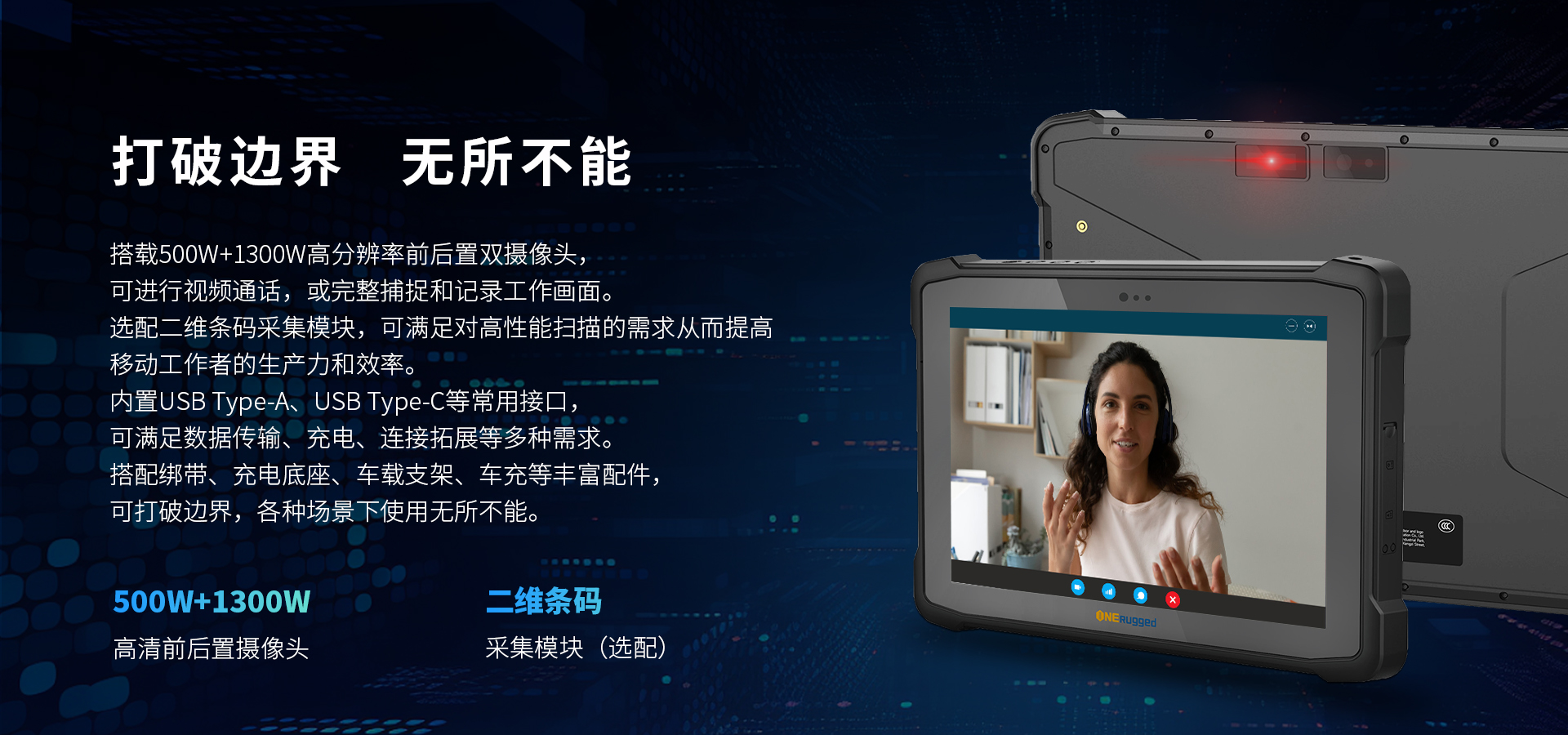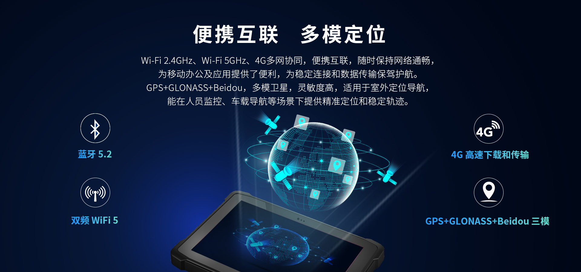500W+1300W高分辨率前后置雙攝像頭,輕松采集工作圖像和視頻信息,3G/4G全網(wǎng)通、雙頻WiFi5、藍牙等多種通訊方式,無線通訊功能強大:支持GPS,Glonass,北斗定位系統(tǒng),定位更準確: