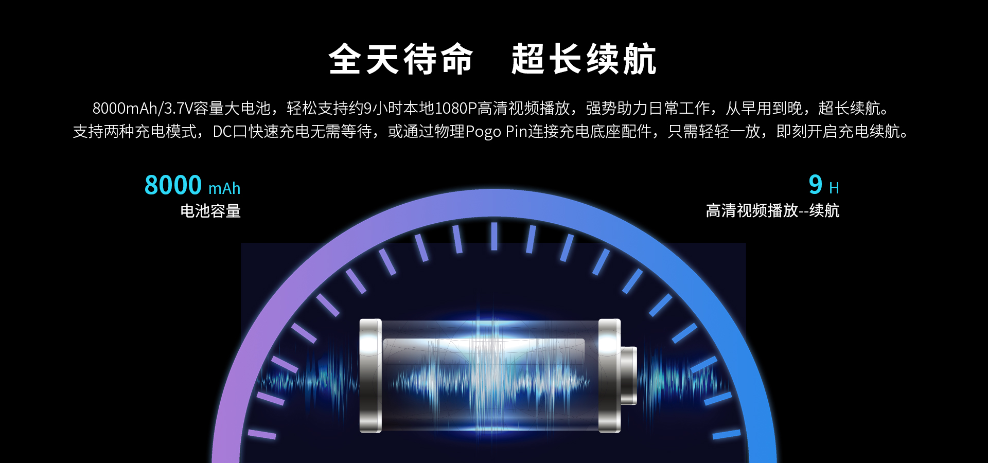 內(nèi)置8000mAh/3.7V聚合物鋰離子電池,機器續(xù)航能力9小時