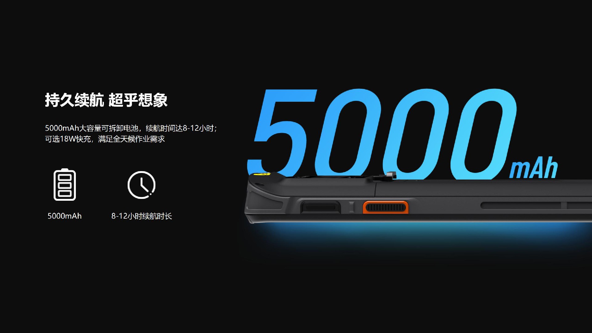 5000mAh大容量可拆卸電池,續(xù)航時(shí)間達(dá)8-12小小時(shí);可選18W快充,滿足全天候作業(yè)需求